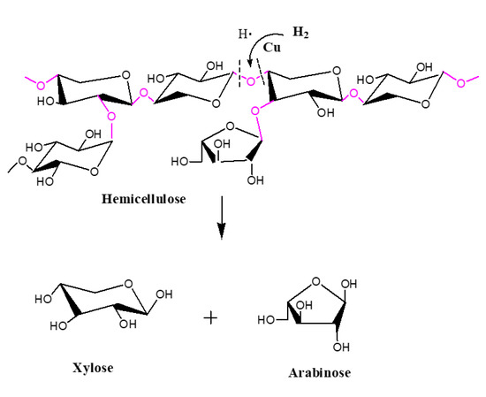 The CuO catalyst reduced and transformed to active Cu0 at high temperature in H2 atmosphere; the more active Cu0 in the catalyst, the higher will be the xylose and the arabinose yields. The elevated temperatures provided more energy required for the catalysis of RS. The active Cu0 was employed for the hydrocracking of the long-chain macromolecules in hemicellulose into low-molecular-weight monosaccharides. These monosaccharides might further convert into other non-sugars in the acidic condition.
