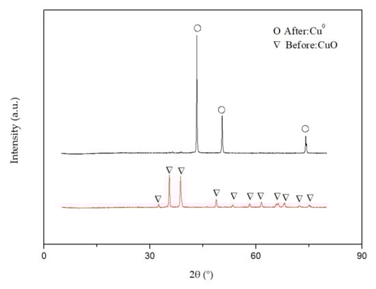 XRD was carried out to test the CuO catalyst before and after hydrogenolysis. The XRD spectrum reflects the characteristic diffraction peaks of the sample compared with the standards from the Joint Committee on Powder Diffraction Standards (JCPDS) card (Figure 3). The apparent diffraction peaks at 2θ = 35.5 and 38.7° in the CuO catalyst before hydrogenolysis indicated the presence of CuO (JCPDS 05-0661), proving that the calcined catalyst was pure CuO before hydrogenolysis reaction. After the hydrogenolysis, the diffraction peaks of CuO disappeared, while the peaks at 2θ = 43.4, 50.4, and 74.1° assignable to metallic Cu0 (JCPDS04-0836) appeared, proving that the CuO catalyst was turned into active Cu0 after the hydrogenolysis of RS [45].