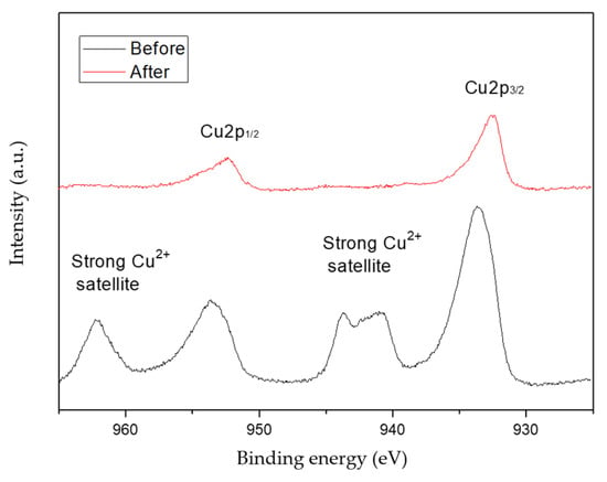 As illustrated in Figure 4, XPS was also carried out to gain further insight into the nature composition information of CuO catalyst before and after hydrogenolysis of RS. We can see from Figure 4, two photoelectron peaks centered at 933.7 and 953.6 eV in Cu2p spectra with two strong satellite peaks at 943.7 and 962.3 eV, suggesting that the predominant species was CuO. Moreover, only two peaks at 933.7 and 953.6 eV associated respectively with Cu2p3/2 and Cu2p1/2 peaks of Cu0 were evident in the catalyst after hydrogenolysis. Additionally, the absence of satellite peaks at 943.7 and 962.3 eV corresponding to the spectra of Cu2+ species in CuO were noted, indicating that Cu2+ in the CuO was fully reduced to Cu0 [46]. Cu2p3/2 peak in Cu (II) oxide was shifted and broader compared to Cu0 metal. The results conform to the XRD analysis in Figure 3.