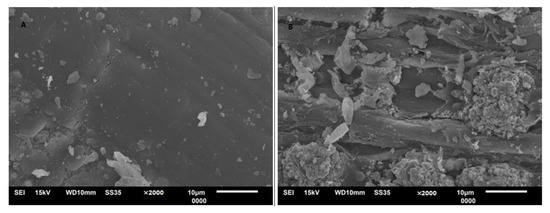 SEM was performed to compare the physical structures of the RS in the solid residues before and after hydrogenolysis samples (Figure 5). The surface of untreated native RS was intact and smooth, covered with a thick layer of wax. It was not conducive to the dissolution of the organic matter of RS and diffusion of the catalysts (Figure 5A). As observed in Figure 5B, after the hydrogenation reaction, the surface severely collapsed, the rigid and ordered fibrils encased in the wax layer disintegrated, pores and cracks emerged on the wall surface, and secondary cell walls were exposed [8].These alterations may be due to the disruption of the structure and reduction in hemicellulose. Morone et al. [47] reported similar changes for other RS treatments.