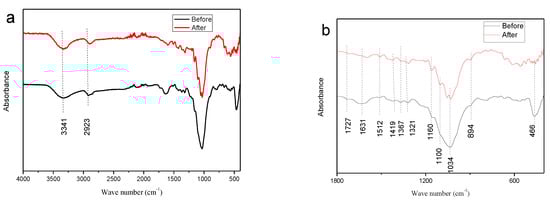 The infrared spectra revealed numerous adsorption peaks in a wavenumber range 4000–400 cm−1. The band at 3341 cm−1 corresponding to O–H stretching represents the vibration of the hydroxyl groups in cellulose and lignin that weakened after catalysis. This suggests the depolymerization of the cellulose and lignin in HRS. The absorption band at 1512 cm−1 represents the characteristic peak of lignin related to the vibration of aromatic rings present in it. The peak at 466 cm−1 reduced sharply after the catalytic reaction, which indicates that the proportion of lignin decreased [48].The two peaks at 1727 cm−1 and 1367 cm−1 represent the alkyl esters of acetyl groups in hemicellulose. Both these peaks were weaker in the spectrum of HRS, indicating the removal of the linkages between hemicellulose and lignin, which provided additional evidence for the successful conversion of hemicelluloses [49]. The results conform to the data in Table 2. The absorption peaks at 2923 cm−1, 1419 cm−1, and 1321 cm−1 corresponding to the C–H stretching vibration from the CH2 group represent the CH2OH group of C6 in cellulose. The peak at 1631 cm−1 represents the C=O group from carboxylic acid with an intermolecular hydrogen bond in RS, and it weakened after the catalytic reaction [8,50]. The characteristic band at 1034 cm−1 decreased in HRS. It represents the C–O–C ether vibration in cellulose and hemicellulose and the C–O stretching in cellulose, hemicellulose, and lignin. The enhancement of C–O–C ring skeletal vibration at 1100 cm−1, the C–O–C glycosidic bond stretching at 1160 cm−1, and β-glycosidic bond stretching at 894 cm−1 after the catalytic reaction indicate the increase in cellulose content in the HRS solid residue, caused by the removal of hemicellulose [49]. The FTIR spectra showed that rigid network structure of rice straw was abolished after the hydrogenolysis process, and the results were consistent with Figure 5b.