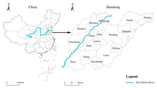 Shandong is located in the eastern part of the North China Plain and the lower reaches of the Yellow River. The region contains 17 prefecture-level cities (see Figure 1). As a major economic province, Shandong’s economic aggregate is always at the forefront of China, and it is in the peak stage of urbanization. The increasing demand for construction land during this period of economic and social development has led to an imbalance between supply and demand for land. At the same time, Shandong is also a large agricultural province, with early agricultural development and high agricultural land use. However, Shandong Province has a vast population and limited land, and by the end of 2007, the per-person cultivated land area of Shandong Province was only 0.081 hectares, while the per-person cultivated land area of 6 cities and 47 counties within Shandong was close to or below the critical line of 0.053 hectares determined by the Food and Agriculture Organization of the United Nations []. In the context of China’s “new normal” economy, the Shandong Provincial Government is stepping up efforts to promote intensive land use, which is worth paying attention to. Therefore, analyzing the contradiction between social and economic development and the limited land resources, the land-use efficiencies, and the changing trends of cities in Shandong Province is not only conducive to the scientific planning of land resources but also provides a direction for promoting the optimal layout and sustainable development of cities. According to the physical geographical features, Shandong can be further divided into three areas []: eastern (Qingdao, Yantai, Weihai, Weifang, Rizhao), midland (Dongying, Zibo, Jinan, Laiwu, Taian, Linyi), and western (Zaozhuang, Jining, Binzhou, Dezhou, Liaocheng, Heze).