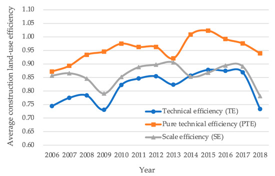 The TE indicates the performance at both the current and future land-use scales, while the PTE reflects the sustainability performance of land use. With the increase in land scale, the SE shows the trend in land-use efficiency. If the SE is equal to 1, it indicates that the DMU is at an effective scale size [].