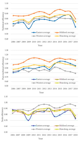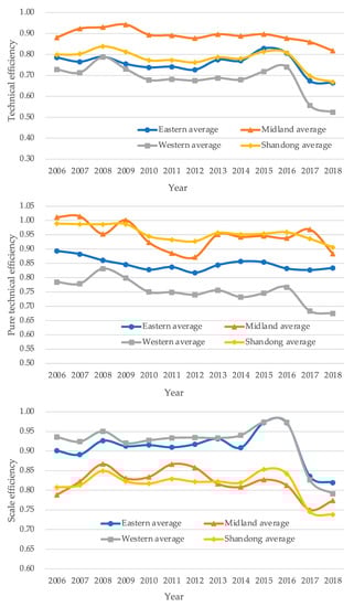 Average technical efficiency, pure technical efficiency, and scale efficiency of cultivated land across three regions in Shandong.