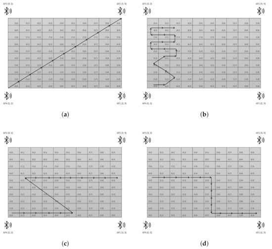 In the second step, the testing of the proposed method is carried out. For this purpose, real-time experiments were conducted in typical indoor setup inside a computer lab. The size of the lab used is 10 × 10 square meter as depicted in Figure 3. We used five Bluetooth version 4.0 enabled smart phones as access Points (AP) and also as a target node. The experimental setup is motivated from literature studies and based on fingerprinting approach, in which an offline database is developed as shown in Figure 3. To evaluate the performance in real time for dynamic localization, we collected measurements of five different trajectories, which resembles human movement with approximately 1 m/s as depicted in Figure 4. We considered five different trajectories: simple, straight, zig zag, forward, back, and long as well for the validation purposes.