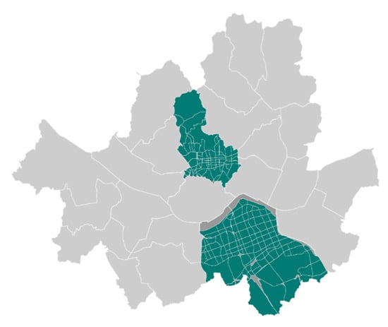 Figure 1 shows where the study sites are. The two northern districts (Jongno-gu and Jung-gu) have old business districts, and the two southern districts (Seocho-gu and Gangnam-gu) have newer business districts. They include some residential regions and also some of the most crowded regions in the daytime that are considered central business districts (CBDs). In addition, they have a similar population density: 8.2 thousand people/km2 for the northern two districts and 8.8 thousand people/km2 for the southern districts [32]. These four districts were selected as study sites because they have similar functions within Seoul but have contrasting urban forms. Figure 1 displays the road network forms of the northern and southern districts—while the southern districts have a grid-like layout, the road networks in the northern districts combine various layouts such as curves and dead ends.