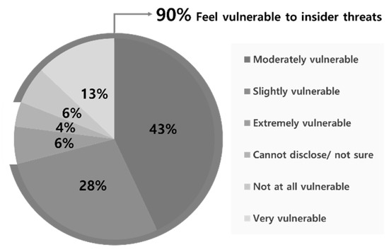An increasing number of security attacks that threaten organizations are occurring, and attacks targeting the main technical information of an organization may cause significant losses that can affect its continued existence. The early security attacks targeting the technical information of organizations were externally generated, such as by hackers from outside an organization capturing its major technologies. However, today’s security attacks are fused and compounded by both inside and outside parties. Alongside security attacks generated from outside the organization, attacks due to the leakage [1] of technical information by organization insiders have been increasing. According to Crowd Research Partners’ [2] Insider Threat Survey Report, 90% of 472 security experts believe they are vulnerable to insider security threats, as shown in Figure 1.
