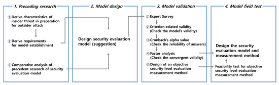 Our study uses the methodology shown in Figure 2 to develop a security level evaluation model for information leakage protection. The research method was composed of the 4th step. In the first step, preceding research, we derive the characteristics of information leakage by insider threat. Subsequently, we derived requirements of security evaluation model focused on prevention of insider threats. We also analyzed precedent research about security evaluation models. In the second step, model design, we considered the result of requirements and analysis when designing a security evaluation model from the perspective of insiders.