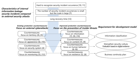 Referring to previous research that analyzed the security level from the perspective of technical information leakage to develop our evaluation model, the characteristics of technical information leakage incidents can be summarized as follows. First, it is difficult to recognize whether a security incident will occur. Second, the number of security incidents is small, but the impact is large. Third, organizations must consider post-incident damage, and recovery will take time. To design protection measures that reflect the characteristics of these technical information leakage accidents, several areas must be improved by adopting new protection measures, as shown in Figure 3.