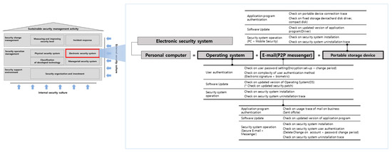 Our study proposed an objective measurement for the evaluation of the “electronic security system” control in order to determine the security level that ensures objectivity. Detailed contents of the objective evaluation in the areas of “electronic security system” are described in Figure 5.
