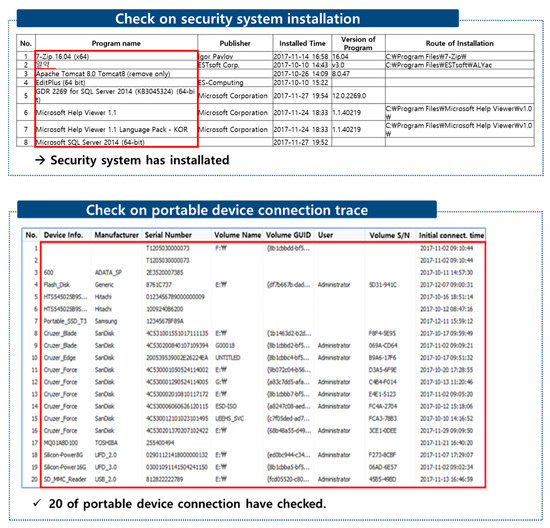 We proceeded with a feasibility study based on the security evaluation model for the protection of the proposed technology, and we attempted to verify the adequacy of the application for the actual corporate environment. The feasibility study period was from 20 November 2017 to 4 December 2017. The target company was a medium-sized Korean manufacturing enterprise with 200 employees. The survey was conducted on personal computers used in the business of the surveyed companies. As shown in Table A2 in Appendix A, we checked that the five detailed controls were not observed. The main contents of the digital trace analysis using the digital forensic tool are shown in Figure 6 below. First, the control “checked on security system installation” checked that the program was installed and evaluated normally. Second, the control “checked on portable device connection trace” was abnormally evaluated by checking the connection trace of 20 storage devices.