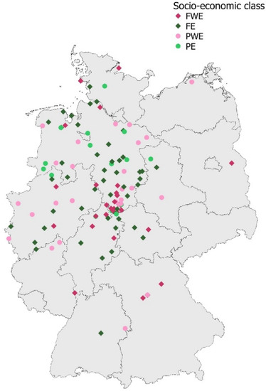 Location of horse farms included in the study in Germany according to socio-economic class (FWE = full-time business without agricultural education, FE = full-time business with agricultural education, PWE = part-time business without agricultural education, PE = part-time business with agricultural education).