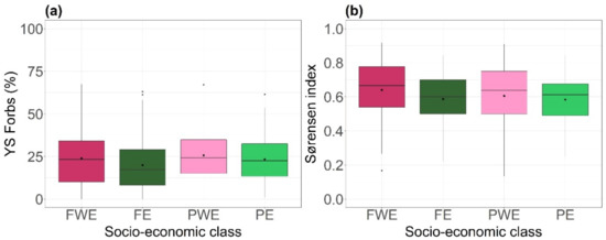(a) Average yield share of forbs (YS Forbs (%)) per paddock and (b) Sørensen index, representing floristic contrast per paddock, depending on socio-economic class (FWE = full-time business without agricultural education, FE = full-time business with agricultural education, PWE = part-time business without agricultural education, PE = part-time business with agricultural education). Boxplots represent median, 1st and 3rd quartiles, outliers and mean (diamond).