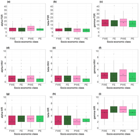 Vegetation characteristics of paddocks grazed by horses depending on socio-economic class (FEW = full-time business without agricultural education, FE = full-time business with agricultural education, PWE = part-time business without agricultural education, PE = part-time business with agricultural education). (a–c) Forb species richness (FSR) at paddock level (alpha-FSR), farm level (gamma-FSR) and between paddocks (beta-FSR); (d–f) High-Nature-Value species richness (HNV) at paddock level (alpha-HNV), farm level (gamma-HNV) and between paddocks (beta-HNV); (g–i) weed and ruderal species richness (WR) at paddock level (alpha-WR), farm level (gamma-WR) and between paddocks (beta-WR). Boxplots represent median, 1st and 3rd quartiles, outliers and mean (diamond).