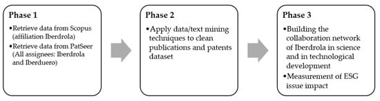 To achieve the objective, the methodology followed employs three important phases before analyzing the results (see Figure 1). These three phases facilitate the identification of scientific collaborations of Iberdrola, both in a general area of development and based on a specification of terms relating to management and sustainability, and the identification of collaborations in the development of patents based on a particular technological field determined by the Cooperative Patent Classification (CPC): Y (general tagging of new technological developments). This method can be applied to any other organization whose strategic approach is based on an OI model. This could give rise to future research whose results will be used for feedback and improvement of strategic know-how.