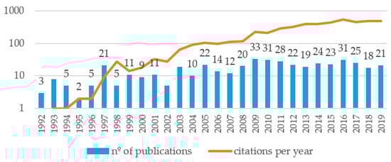 After further investigating and updating the study by Naiara et al. [], the company Iberdrola began to develop its scientific activity during its diffusion phase in 1992, collaborating on three articles. In addition, the company has collaborated on an average of 19 publications per year in the last 15 years, with 2009 being the most productive year with 33 publications, as shown in Figure 2 (on a logarithmic basis). However, the most remarkable thing was the significant growth in the number of citations received for these articles, which means that they were of great interest to new developments within the scientific and technological community.