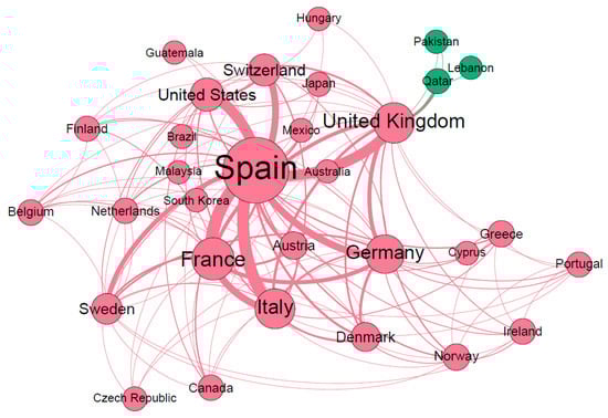 In terms of production by country, as shown in Table 1, the country with the most publications was Spain (430), followed by the UK (36), the USA (29), and France with 27 documents. In general, Europe countries were the main driving force behind Iberdrola’s scientific development. Nonetheless, if the map of collaborations between countries is generated and the degree of the relationship quantified using the software Gephi (see Figure 3), it is observed that it was mainly the European countries with the highest levels of collaboration. Some authors believe that this may be due to funding of projects by the European Commission, which promotes collaboration between European countries. With the exception of the USA, whose level of collaboration was lower than the productive one, it was still ranked among the best positions, and Qatar, whose level of collaboration was lower than the top 10.