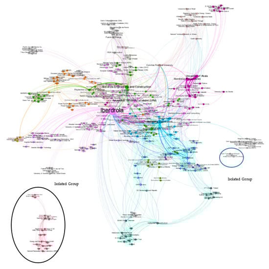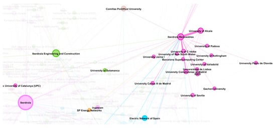 As far as affiliations were concerned, in the clean-up phase the main sections of Iberdrola—Iberdrola, Iberdrola Distribution, Iberdrola Engineering and Construction, Iberdrola Engineering and Consulting, Iberdrola Renewables, Iberdrola Generation, Iberdrola Nuclear Generation, and Global Smart Grids Iberdrola—plus Iberdrola Internacional (depending on the country), were defined as independent affiliations. In order to identify Iberdrola’s scientific collaboration activities, an effective method was a network analysis. The network was generated through a matrix of co-occurrences and plotted using Gephi (see Figure 4). As indicated in Figure 4, the isolated groups are small collaboration groups linked to Iberdrola Internacional, such as Iberdrola renewables US, which collaborates with NASA, the US Department of Energy, University of Washington, Santa Clara University, and the National Renewable Energy Laboratory, among others, and Iberdrola Portugal, which collaborates with companies in that country.
