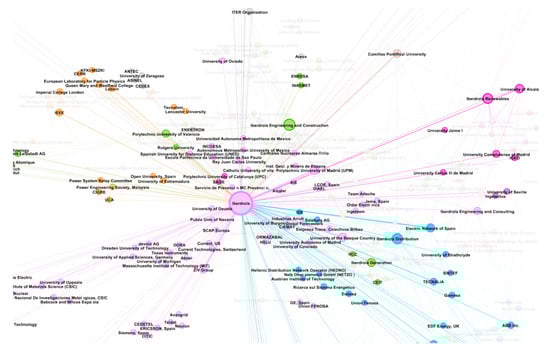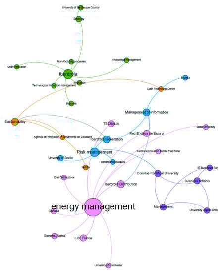 Iberdrola, apart from collaborating in the scientific development of its main area of business interest, namely energy, also collaborated in research areas related to business management, such as open innovation (the first year the term appeared was 2009), business (2000), technological innovation management (2002), knowledge management (2009), energy management (2009), risk management (2009), management of information (2010), strategy (2014), business schools (2020), sustainability (2020), and management (2020). Figure 13 shows the organizations involved in joint research with Iberdrola in these knowledge areas linked to business management.