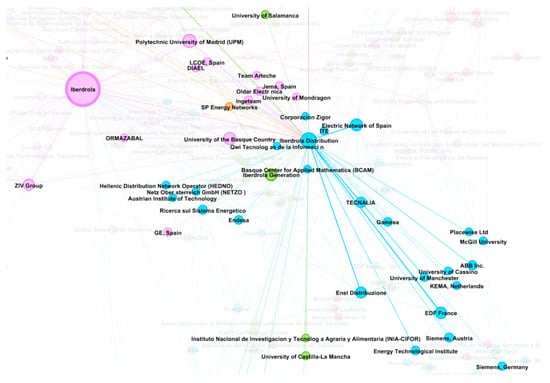In the case of Iberdrola Distribution, regarding universities, it collaborated mainly with Spanish universities such as Comillas Pontifical University, Polytechnic University of Madrid, University of the Basque Country, University of Salamanca, and University of Mondragon, and international ones such as University of Manchester and University of Cassino (see Figure 6). As far as other types of collaborations were concerned, the main companies with which it collaborated were the international companies EDF France, Enel Distribuzione, Siemens (Austria and Germany), and the national companies Team Arteche, Corporacion Zigor, Jema, and Ingeteam, among others. It also collaborated with research centers such as the Basque Center for Applied Mathematics (BCAM), the Energy Technological Institute, and the Austrian Institute of Technology.