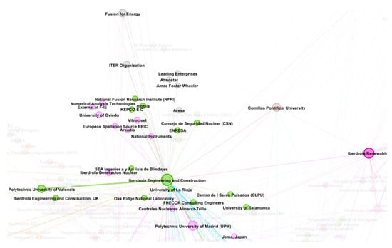 As far as Iberdrola Engineering and Construction was concerned, it collaborated with various sections, namely, Iberdrola Nuclear Generation, Iberdrola Generation, Iberdrola Distribution, and Iberdrola Renewables. In addition, it collaborated mainly with research centers and companies, both Spanish and international, such as the National Fusion Research Institute (South Korea), mobiis (South Korea), Vitrociset (Italy), the Research Applications Laboratory (USA), Oak Ridge National Laboratory (USA), ASG Superconductors (Italy), International Thermonuclear Experimental Reactor ITER organization, Fusion for Energy (EU), Jema (Japan), and National Instruments (USA), among others. In this case, collaboration with universities (University of la Rioja, Polytechnic University of Madrid and Valencia, and University of Salamanca) did occur but with less intensity than in other sections of Iberdrola (see Figure 7).