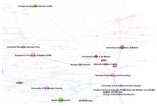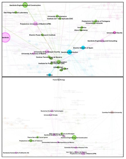 Regarding Iberdrola Engineering and Consulting (see Figure 8), its main collaborators were Spanish universities (University Complutense of Madrid, University of the Basque Country, Polytechnic University of Madrid, and University of Las Palmas de Gran Canaria), research centers (NEIKER, CIEMAT, and the Foundation Center for Environmental Studies of the Mediterranean (CEAM)), consulting enterprises (EPPG/EBSCO and Serled Consultores) and international companies (CLH, VTT Energy Finland, and EDF France), as well as with nuclear organizations such as nuclear power plants and the Nuclear Safety Council (CSN).