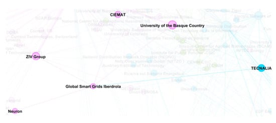 Iberdrola’s international sections, in general, played an important role when searching for allies in the corresponding country, creating geographically located working groups. With regard to Iberdrola’s newest section, Global Smart Grids, Iberdrola collaborated with the University of the Basque Country, Tecnalia, CIEMAT, Neuron, and the ZIV group (see Figure 11).