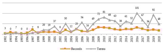 In addition, the analysis of keywords or new terms generated over the years allowed us to identify the company’s progress when researching new fields of scientific development. As indicated in Figure 12, the number of new terms grew as the number of publications increased, which indicated the company’s interest in embracing a greater scientific dimension and expanding its scientific domains.