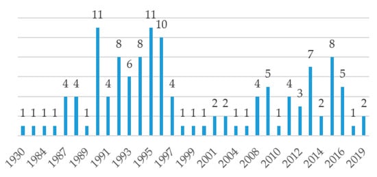As indicated in Figure 14, the evolution of inventions evolved in such a way that there were periods that were more productive than others. For this reason, we analyzed the year in which the invention was created, also known as the priority year. The period between 1990 and 1996 stood out as the most productive. In addition, another interesting period, with variability in the number of inventions, was between 2008 and 2016.