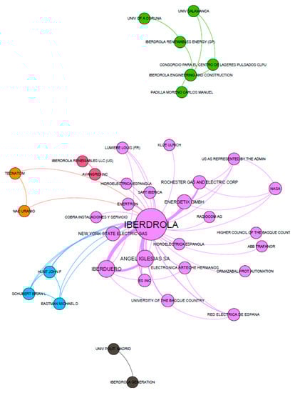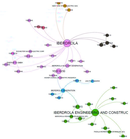 In order to identify collaborations between assignees within a technological development framework based on sustainability criteria, such as technological developments that aim to mitigate climate change, the network of relationships between assignees and CPCs (Y02) was carried out (see Figure 22). Six clusters were defined, and in the biggest one Iberdrola shared ownership of patents with Rochester Gas and Electric, Energetix, Nac Uranio, Tecnaton, the Higher Council of Scientific Research, and Iberdrola Nuclear Generation. A second cluster was led by Iberdrola Engineering and Construction and related to Iberdrola Renewables Spain and Carlos Manuel Padilla. Iberdrola Generation formed the third cluster together with the Polytechnic University of Madrid. The other three small clusters linked Iberdrola with Saft Iberica, New York State Gas and Electric, and Iberduero.