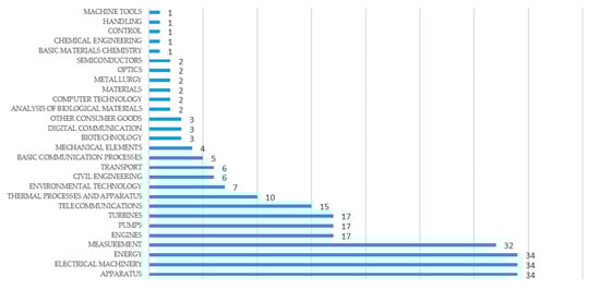 The technical domain of patent analysis allowed us to identify the main fields of technological development (see Figure 16). This classification of the patent based on the technical domain was specified by the technical expert of the patent office []. The main domains were apparatus, electrical machinery, energy, measurement, engines, pumps, turbines, and telecommunications, among the 26 different domains that the patents presented.
