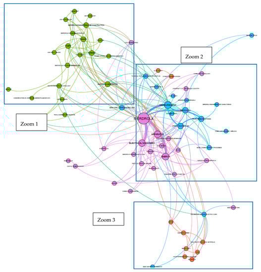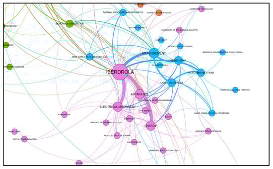 With regard to Iberdrola as the main company, in zoom 2 (Figure 19) we can see a greater diversification in domains. Nevertheless, they were mainly grouped in two clusters. In the first place were those linked to domains related to apparatus, energy, and electrical machinery, together with the companies Enertron, Electronica Arteche Hermanos, Red Electrica de España, Saft Iberica, Avangrid, and the University of the Basque Country, among others. In addition, Avangrid was also linked to digital communication and civil engineering, and the University of the Basque Country with computer technology. Second the blue cluster, with companies such as Angel Iglesias, Iberduero, New York State Electric and Gas, and Rochester Gas and Electric Corp focused on domains linked to measurement, telecommunications, thermal processes and apparatus, and basic communication processes.