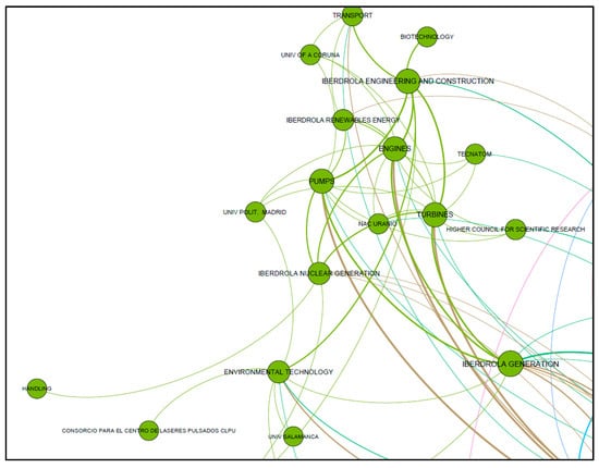 For better comprehension, the three most important parts of the network were zoomed in on. As shown in Figure 18, the main technical domains of Iberdrola Nuclear Generation, Iberdrola Generation, Iberdrola Engineering and Construction, Iberdrola Renewables, Nac Uranio; Polytechnic University of Madrid (UPM), and University of La Coruña were related to engines, pumps, and turbines, among others, highlighting the link between Iberdrola Generation, UPM, University of Salamanca, CLPU, and environmental technology. The biotechnology domain also appeared as an isolated area linked to Iberdrola Engineering and Construction.