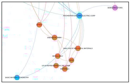 Regarding another important cluster (orange), zoom 3, linked companies such as NASA, Energetix, and the US Administration with technical domains related to metallurgy, materials, optics, and analysis of biological materials (See Figure 20).