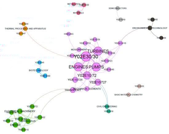 In order to deepen the technological development, patents were analyzed based on the Cooperative Patent Classification (CPC). More specifically, patents classified as Y02 (General Tagging of New Technological Developments: Technologies or Applications for Mitigation or Adaptation Against Climate Change) were analyzed in order to identify Iberdrola’s collaborations with other assignees in the field of technological development for purposes based on sustainability. However, in order to clarify the meaning of the CPC codes offered by the patents, a network had to be made to link the technical domains with the CPC classifications (see Figure 21). The most common classification in all groupings was Y02E, which represents, reduction of greenhouse gas emissions related to energy generation, transmission, or distribution, or related to turbines, engines, pumps, transport, mechanical elements, biotechnology, thermal processes and apparatus, semiconductors, electrical machinery, energy, apparatus, and basic materials chemistry. In addition, there were other relationships such as metallurgy and materials with Y02P (climate change mitigation technologies in the production or processing of goods), environmental technology with Y02C (capture, storage, sequestration or, disposal of greenhouse gases), and civil engineering with Y02A (technologies for adaptation to climate change).