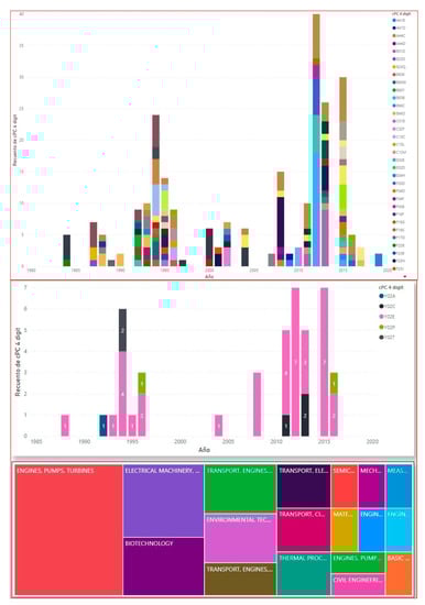 Once Iberdrola’s collaborative relationships for its technological development in different technical domains were analyzed and identified, it was important to determine how the company had evolved in its technical work areas. To this end, the profile of the patents was analyzed by priority year and CPC code. As shown in Figure 23, the number of patents in which Iberdrola participated started to regain importance (after some relatively unproductive years at the beginning of the decade) from the year 2007–2008, emphasizing its wide technical diversification, especially in the year 2015, which implied greater collaborative diversification, and the year 2012, as a more productive year but with a greater concentration of technological fields. Regarding CPC Y02, it is important to highlight the importance it acquired in the last 10 years, directing innovative efforts towards technologies that prevent climate change.