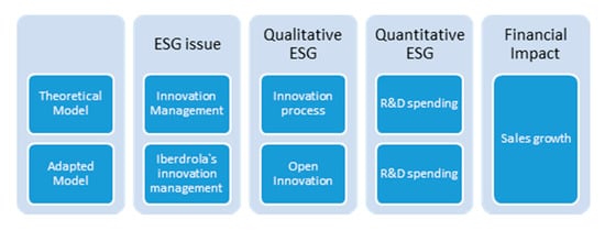 The change in direction of Iberdrola’s strategy towards an innovation management model based on the OI paradigm denoted a significant increase in its research, and technological development resulted in a collaborative way, as this research work shows. However, could it be said that this strategic change had an effect on the company’s reputation? A company’s reputation, being intangible, is very difficult to quantify. Nonetheless, there are various ways to measure it. One of the most established measures of reputation is ranking by media, such as Fortune, which is widely used by the scientific community to measure the link between reputation and other strategic variables []. One of the attributes used by Fortune [] is long-term value creation that integrates financial, social, and environmental values to establish a sustainable business model. In addition, different studies confirm that companies with good performance in environmental, social, and governance (ESG) issues boast superior financial performance [,]. According to Schoenmaker and Schramade [], a qualitative and quantitative evaluation of the ESG issues to be analyzed makes it possible to ascertain the financial impact it produces. As Figure 24 shows, the financial impact of the qualitative and quantitative information on ESG is measured through sales growth. In the case of innovation management (as an ESG issue), qualitative information about the innovation process is established and the quantitative information measures the expenditure in R&D, and consequently the financial impact indicator is established in the increase of sales. If we turn to the company Iberdrola, the creation of long-term value of innovation management is qualitatively focused on the OI perspective.