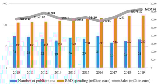 Number of publications, R&D spending, and sales of Iberdrola (2010–2019). Data on R&D spending and sales obtained from Iberdrola’s annual reports [].
