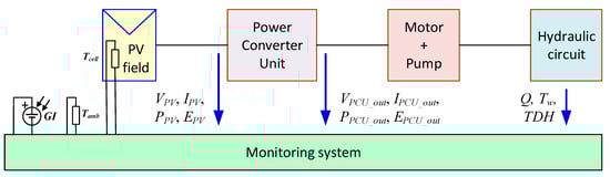 Block diagram of a photovoltaic water pumping system (PVWPS) and the main magnitudes measured by the monitoring system.