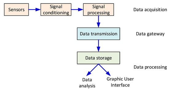 A block diagram of the parts included in a monitoring system is presented in Figure 2. An extended version and some explanations about the devices used in each block can be found in []. A description of the most common sensors used in PV monitoring systems—including information about other parts needed in such a system (data acquisition, data transmission, data storage, and data processing)—is presented in [].