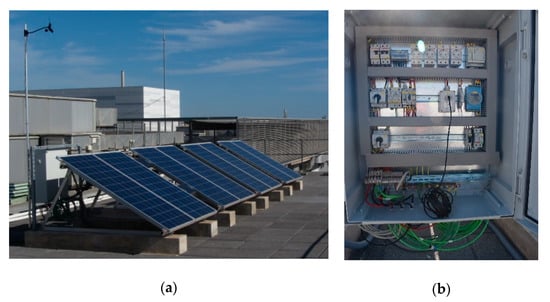 Photovoltaic (PV) installation on the roof terrace. (a) View of the PV field, with the electrical enclosure behind the modules. (b) View of the components included in the electrical enclosure.