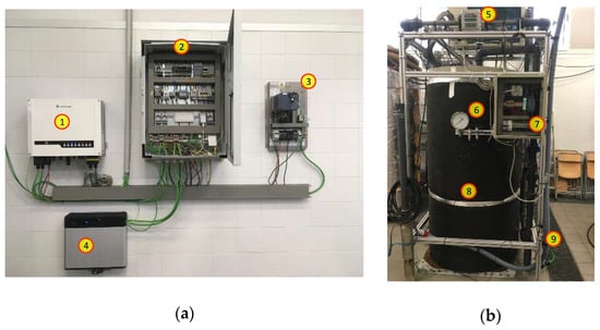 - An electrical panel that establishes the connection between the PV system arranged on the roof of the building and the other system components, including a connection to the electrical power network (Figure 4(a2)). The electrical panel also includes a UWP 3.0 unit that monitors the devices connected to the RS485 local bus via a Modbus-RTU protocol [].
