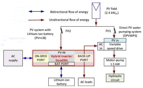 Figure 5 shows the block diagram of the PV facility, including information about the flows of energy between the different components of the installation. By means of the fused disconnect switches included in the lab electrical panel, the following modes of operation of the PV facility can be manually selected: