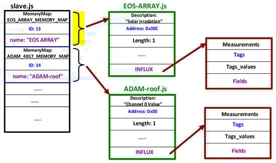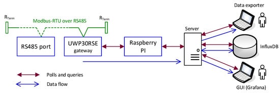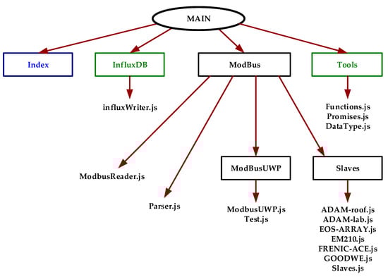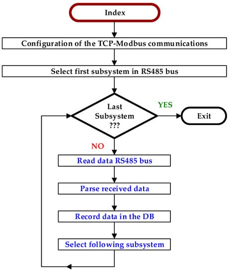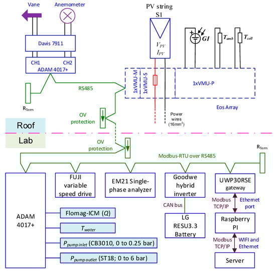 A commercial universal web platform, the UWP 3.0, operates as a communications gateway between all the devices connected through a Modbus-RTU over the RS485 and the data acquisition system (that uses a Modbus TCP/IP), as shown in Figure 6 with green lines. All the devices without RS485 output are connected to an ADAM 4017+ unit, a 16-bit universal analog input module with Modbus output []. The ADAM 4017+ has 8 input channels that can be configured in accordance with the sensor characteristics: 4–20 mA, ±150 mV, etc.