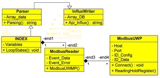 Although the UWP3 can be used as a web server, including a GUI, it was decided to connect its Ethernet port to an embedded system (Raspberry Pi), which connects to the university network via a WiFi connection. The Raspberry PI operates over the Modbus TCP/IP protocol as a client of the UWP3 and sends the data to a DB server with a sampling rate that can be adjusted depending on the type of experiment to be performed, with the option of choosing sampling times from five seconds. Data gathered by the Raspberry PI and transmitted via its WiFi port are received in the server via the university Ethernet network. The block diagram of the monitoring system is shown in Figure 7.