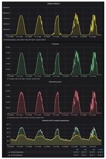 Two grid-connected PV plants were monitored using the data recorded by PV inverters, i.e., 32 microinverters from Enphase and 6 string inverters from SMA []. Data from the microinverters were obtained from the webpage of the manufacturer by means of a Python language script. Another script in Python was executed in the Selenium open-source tool to access the web server that was included in each SMA inverter. For the two installations, a custom communication interface made in Node.js established communication between the PostgreSQL database stored in a local server and Amazon Web Services, where all the data were finally stored and displayed through open-source software.