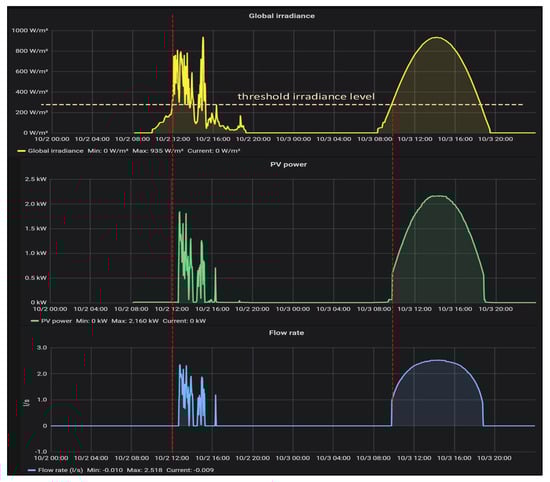 The monitoring of PV systems is crucial for supervising, evaluating, maintaining, and improving PV plants. Sizing approaches and models of PVWPSs are refined using the data acquired with the monitoring systems included in these facilities. The monitoring of PV systems has been an important topic in the last decade, as demonstrated by the many works published in the field [,,,,,,]. These works show that PV monitoring is mainly intended for the following activities: