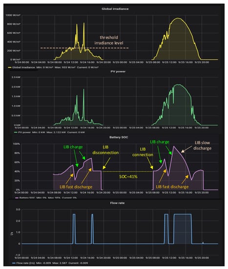 To monitor and carry out data acquisition that enables LIBs to be used as support in PVWPS, a small PVWPS+LIB prototype was built and monitored at the Universitat Politècnica de València (latitude 39.483, longitude −0.345).