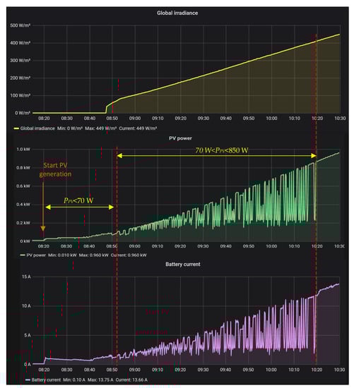 A prototype of a monitoring system for stand-alone PV systems using IoT techniques was proposed in []. The system was tested in an installation that included a PV field with 363 Wpk, a 12 V battery, a maximum power point tracking (MPPT) charge regulator, and several DC loads. An Arduino Mega2560 board was used to acquire the following variables: VPV, IPV, GI, Tamb, and load voltage and current (VPCU_out and IPCU_out). Although an LCD display showed the monitored data in real time and the system status, a WiFi module was used to transmit the data to the Internet, where a website developed in JavaScript stores and displays the acquired data and the state of the system.