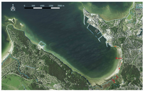 Aerial view of the site in Tallinn with the location of the interventions noted with orange dots and red outlines. (Source: Orthophoto—Estonian Land Board 2020 [65] Published under Licence of open data by Estonian Land Board, 1 July 2018).